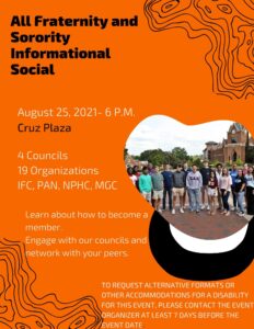 Any students interested in hearing more about Mercer’s fraternities and sororities are invited to attend the all fraternity and sorority informational social on Wednesday, August 25 at 6 p.m. Leaders from fraternity and sorority chapters and councils will be present to answer questions and share information.