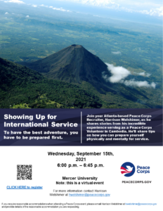 Join Mercer's Peace Corps Recruiter, Harrison Welshimer, as he shares stories from his incredible experience serving as a Peace Corps Volunteer in Cambodia. He’ll share tips on how you can prepare yourself physically and mentally for service.