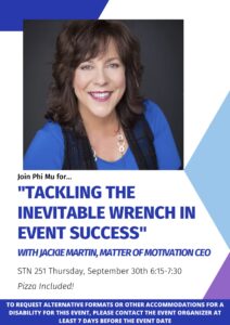 Come join Phi Mu in STN 251, September 30th at 6:15 PM with Matter of Motivation CEO and TedxTalk speaker Jackie Martin to learn how to better serve your organizations through adaptive leadership in the face of crisis and chaos. Jackie will lead us through relevant scenarios and corresponding strategies for event safety. At the…