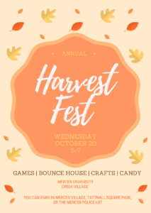 This year, Harvest Fest will be on Wednesday, October 20th from 5pm to 7pm in Greek Village. Harvest Fest is an event hosted by Mercer Panhellenic for Macon elementary students and their families to visit Mercer for an afternoon of crafts and fun. Organizations are invited to set up a table in Greek Village with a…