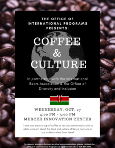 Come join us on Wednesday for our second Coffee & Culture event of the semester! Hear from one of our Mercer students about the food and culture of Kenya, all while snacking on some traditional treats!