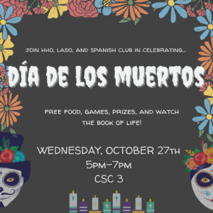 Join the Hispanic Health Organization (HHO), the Latin American Student Organization (LASO), and Spanish Club in celebrating Día de Los Muertos (Day of the Dead) by attending our informational presentation and eating cultural foods while watching The Book of Life. After the movie, we will have games where you could win some cultural prizes!