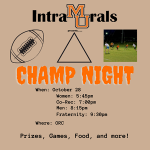 Come on out and cheer on our Championship Game Flag Football teams! There will be pizza, games, and tons of fun at the ORC! The game times are as follows: Women's at 5:45, Co-Rec at 7:00, Men's at 8:15, and Fraternity at 9:30!