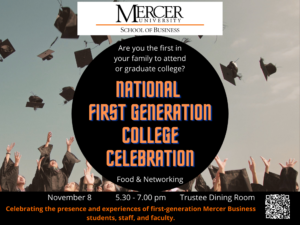 Are you a Mercer Business student and the first in your family to attend or graduate college? Join us in celebrating the presence and experiences of Mercer Business faculty, staff, and students. This is a great opportunity to network with like-minded achievers and enjoy some good food!