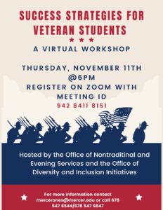 The Office of Nontraditional and Evening Services and the Office of Diversity and Inclusion Initiatives presents a virtual workshop for veteran students to help ease the transition to student life.