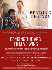 The Association of Global Health and Mercer Students Mark HIV @ 40 are collaborating to show "Bending the Arc" in EGC 110. The film focuses on the accomplishments of Partners in Health, a nonprofit organization founded by Dr. Paul Farmer and his colleagues. Their international work treating HIV and TB has shaped the field of…