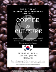 Come and enjoy a cup of coffee or tea and some snacks with us while we learn about the food and culture of Korea from some of our international and study abroad students!
