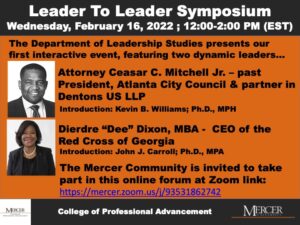 Our first Leader to Leader Symposium will be "layered" in that our speakers will talk about leading during a transition period, while simultaneously responding to COVID-19, and dealing with the day to day leadership responsibilities of their organizations. Zoom link -- mercer.zoom.us/j/93531862742