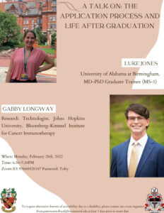 Our speakers are going to be Luke Jones and Gabby Longway, two Mercer alums from the class of 2021. Together they are going to do a panel-style talk on the admissions process, applications, and what life is like in post-undergraduate programs. Attend Via Zoom. Zoom ID: 936688281687 password: Toby