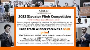 Think you have a good business idea? Submit a 2 minute video pitch of your idea to the 2022 Mercer University Elevator Pitch Competition. The best video pitches will be selected as finalists for a live virtual elevator pitch competition. All ideas are encouraged with multiple tracks from high-tech to social enterprise. Every track winner…