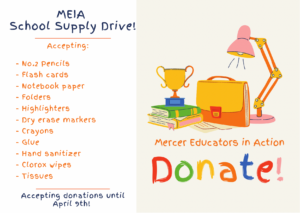 Mercer Educators in Action is a club that serves the schools in Macon's community. We are collecting school supplies until April 9th. Drop off any school supplies in the boxes in Stetson Hall Lobby!