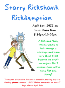A Rick and Morty themed excuse to look through a telescope and learn more about stars because we aren't art majors. Did I mention there will be some Rick and Morty?