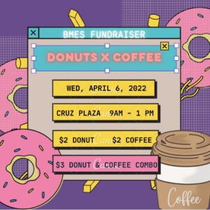 BMES is selling Coffee and Donuts to celebrate the start of Spring! 2 dollars for a donut or coffee or buy both for only 3 dollars!
