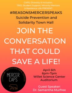 As Mercer gears up to put on the Hope Walks Here Suicide Awareness Campus Walk (April 9th), with the help of Diversity & Inclusion, TRIO, Student Support, Minority Mentors and Residence Life, CAPS will be hosting a Suicide Prevention and Solidarity Town Hall (April 6th) for students. We will have a special guest speaker, our…