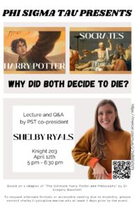 Join Phi Sigma Tau on April 12th as we host a student lecture event by Co-President Shelby Ryals on the topic: Why did Harry Potter and Socrates both decide to die? This lecture is based on a chapter within "The Ultimate Harry Potter and Philosophy", written by Dr. Gregory Bassham. Being hosted in Knight 203…