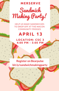 Help MerServe make sandwiches to drop off at the Macon Community Fridge! This is a great opportunity to volunteer on-campus in CSC 3. Register on BearPulse. Follow us on Instagram @mercermerserve for updates.
