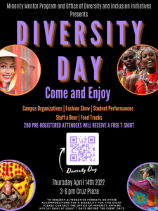 The Minority Mentor Program and the Office of Diversity & Inclusion Initiatives would like to invite you to Diversity Day on April 14 from 3-6 p.m. on Cruz Plaza. Students will have the chance to learn more about our multicultural student organizations on campus and enjoy cultural performances, food vendors, a fashion show, and Stuff…