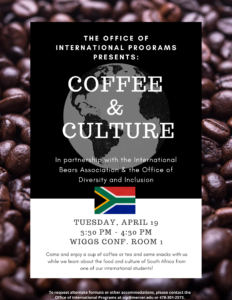 Come and enjoy a cup of coffee or tea and some snacks with us while we learn about the food and culture of South Africa from one of our international students!