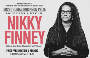 Mercer University’s Spencer B. King Jr. Center for Southern Studies will award the 2022 Thomas Robinson Prize for Southern Literature to renowned poet, professor and author Nikky Finney. The prize will be presented April 23 at 1 p.m. in the Presidents Dining Room inside the University Center on the Macon campus. “Words come and go.…