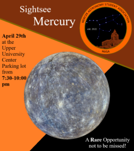 Come see the planet Mercury on one of the only nights this year it will be visible to the naked eye. No need to book or pay in advance to attend, merely come over and look. Professional astronomy equipment will be present to capture the full magnitude of Mercury's grandeur. Do NOT look directly at…