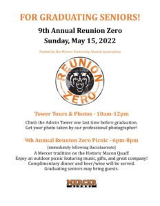 Join the Mercer Alumni Association for our 9th Annual Reunion Zero celebration! There will be two events: Tower Tours & Photos ∙ 10 a.m. - 12 p.m. Climb the Admin Tower one last time before graduation. Get your photo taken by our professional photographer! 9th Annual Reunion Zero Picnic ∙ 6-8 p.m. A Mercer tradition…