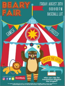 Join QuadWorks at their first big event of the semester 6-8 p.m. Aug. 26 at the Beary Fair in the baseball lot. Free food, fair games, a caricature artist and more! Compete to ride the mechanical gator the longest! Come with friends and make more at the event!