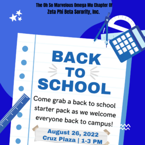 We are kicking off the school year right with starter packs for our new and returning Bears! Come and see the ladies of Omega Mu on Cruz Plaza from 1-3 p.m. Aug. 26 for a chat, some goodies, and well wishes for an amazing year!