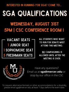 Do you want to serve on SGA and help amplify the voices of the student body? Join us for SGA Qualifications at 5 p.m. Aug. 31 in Connell Student Center Conference Room 1! All students interested in running must attend this meeting in order to qualify. No campaigning is allowed until after the meeting is…
