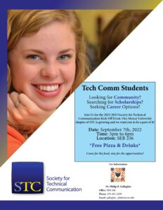 Looking for community? Searching for scholarships? Seeking career options? Join us for the 2022-23 Society for Technical Communication (STC) Kick-Off event. Our Mercer University chapter of STC is growing, and we want you to be a part of it! **Free pizza and drinks**