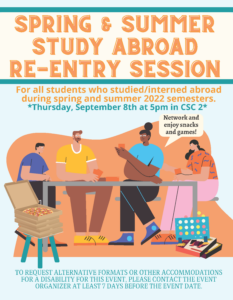 Calling all returned study abroad students! Join us for an hour of networking with other students who went abroad, playing some fun games, getting useful tips on how to capitalize on your experience abroad during interviews and on CVs, and enjoying delicious pizza and snacks! Trust us, you won’t want to miss it!