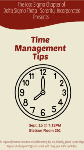 The Iota Sigma Chapter of Delta Sigma Theta Sorority, Incorporated presents our first event of the academic year, Time Management Skills. We are excited to share with you tips and tricks to managing your time efficiently with a busy schedule. We can’t wait to see you on Thursday, September 15th in Stetson 251 at 7:13pm.