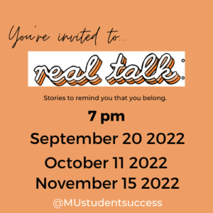 Real Talk is a monthly series featuring speakers you know, stories from their lives, and real talk about the ups and downs of navigating college. Get to know the people behind the podiums and the faces you see on campus, and learn that you are not alone in the challenges you face. Real Talk is…