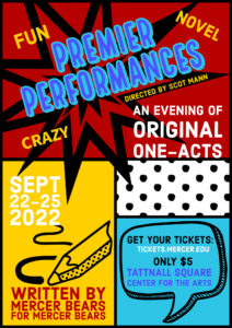 For Mercer Bears, by Mercer Bears – most of all, this show is for you! An evening of original one-act plays from the 2021 playwrighting class. These never-before-seen plays promise to be fun, original and crazy. This show will be only $5 to attend, a 50% savings over most Mercer Theatre tickets.