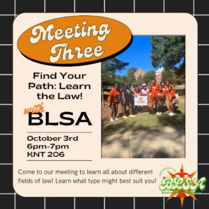 If you're interested in knowing more about the field of law, this meeting is for you! BLSA will survey a multitude of types of law, and help you find the right path for you!