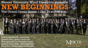Mercer Wind Ensemble presents “New Beginnings” 7:30 p.m., Grand Opera House Brittan Braddock and Nate Gay, conductors Please join the Mercer University Wind Ensemble for an evening of wind band music celebrating the past and the present at the Grand Opera House. This concert will mark the first with new faculty member and director of…