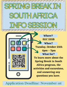Come learn more about the Spring Break in South Africa program, the activities and excursions, and get any questions you have answered.