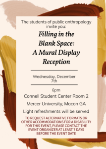 An event to commemorate the work of students and artists in the creation of a mural representing the Macon-Mercer community. The program will focus on education about the processes of social justice and the importance of public art and anthropology in communities.