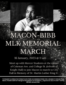 Meet up with Mercer students at 11 a.m. on Monday, Jan. 16, on the corner of Coleman Avenue and College Street (in front of Knight Hall) to join Macon to march to the Macon-Bibb County Government Center in memory of Dr. Martin Luther King Jr.