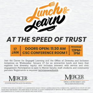 Join the Center for Engaged Learning and the Office of Diversity and Inclusion Initiatives on Wednesday, January 17, for an interactive lunch and learn that explores how diversity, equity, and inclusion intersect with service and civic engagement. Participation is open to Mercer faculty, staff, students, and community partners. Registration is required: bit.ly/engagedlunch. Doors will open…
