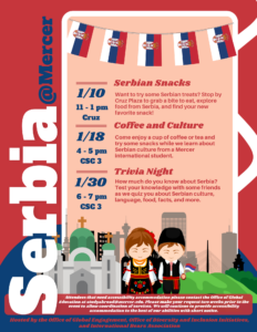Come enjoy a cup of coffee or tea and try some snacks while we learn about Serbian culture from a Mercer international student.