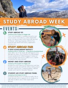 If you are interested in studying abroad or just want to learn more about it, come attend this quick info session about all things study abroad at Mercer including programs, scholarships, financial aid, health and safety, application process, etc.!